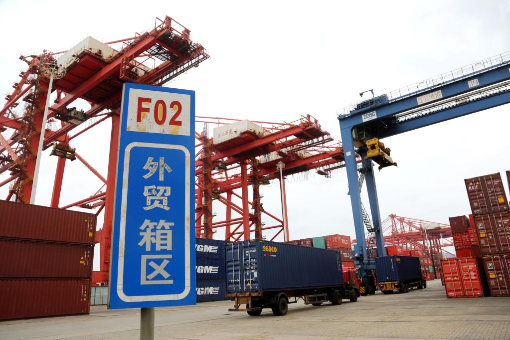 5月9日,在江蘇省連云港港集裝箱碼頭,運(yùn)輸車輛向貨輪轉(zhuǎn)運(yùn)集裝箱。新華社發(fā)(王春攝)