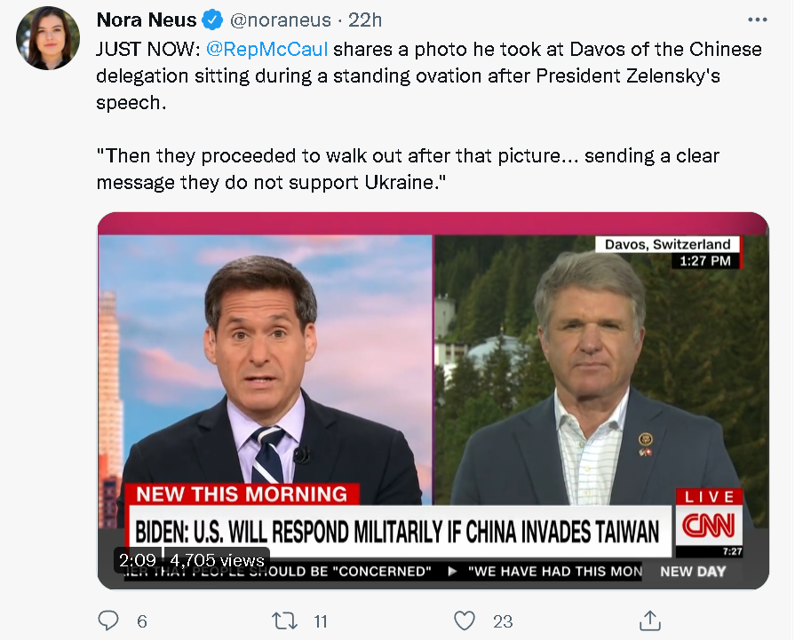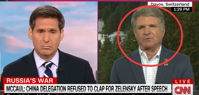 這場(chǎng)演講結(jié)束后,一個(gè)當(dāng)時(shí)在現(xiàn)場(chǎng)參會(huì)的美國(guó)政客,突然找到了美國(guó)CNN的新聞主播約翰·伯曼(John Berman),稱他拍到了一張“中國(guó)代表團(tuán)”在澤連斯基講話結(jié)束后拒絕鼓掌,還迅速離席的照片。這個(gè)名叫邁克尓·麥考爾(Michael McCaul)的美國(guó)政客還指控說(shuō),“中國(guó)代表團(tuán)”的做法說(shuō)明他們“不支持烏克蘭”,甚至稱中國(guó)代表團(tuán)的手上“沾滿了烏克蘭人的鮮血”。