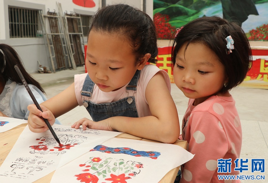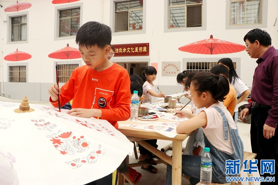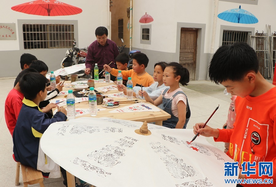 ▲在江西省遂川縣黃坑鄉(xiāng)龍口村,孩童們跟著當(dāng)?shù)赜图垈阒谱鱾鞒腥撕HA,學(xué)繪紙傘面圖畫。新華網(wǎng)發(fā) 李建平 攝