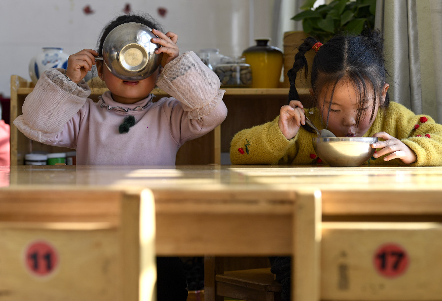 ↑寧夏吳忠市鹽池縣針對農(nóng)村幼兒和特殊教育學生實施營養(yǎng)改善計劃,普及免費營養(yǎng)午餐。這是4歲的孫月月(左)和周詩茹在鹽池縣高沙窩鎮(zhèn)幼兒園享用免費營養(yǎng)午餐(2019年11月26日攝)。