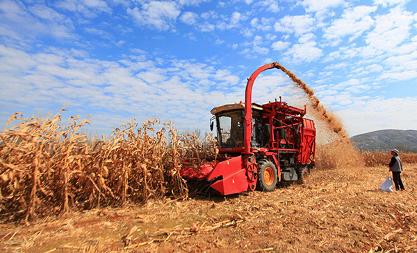 2021年10月23日,農(nóng)民駕駛收割機在山東省臨沂市平邑縣流峪鎮(zhèn)北申莊村田間收獲玉米。(新華社發(fā))