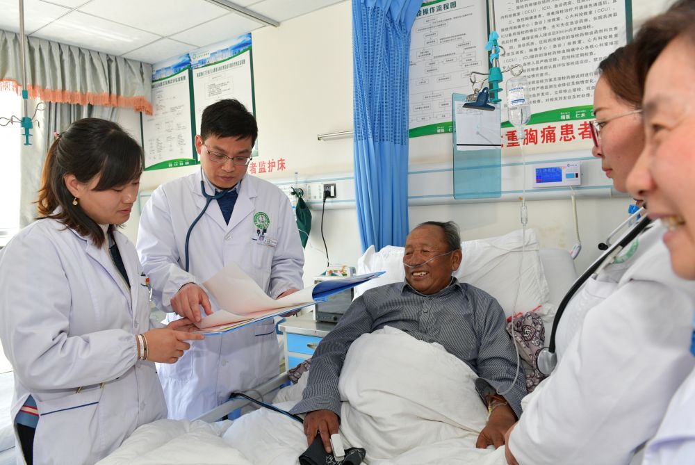 在西藏山南市人民醫(yī)院,來(lái)自安徽的援藏醫(yī)生梁有峰(左二)帶領(lǐng)醫(yī)生們查房。“組團(tuán)式”醫(yī)療援藏提升了山南市醫(yī)療水平(2019年4月24日攝)。