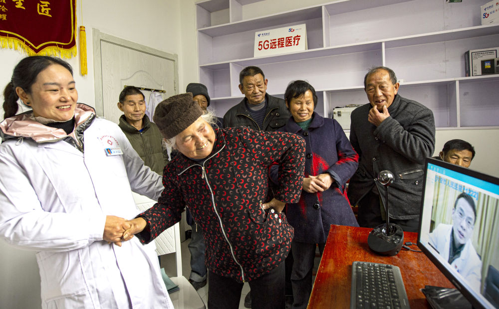 安徽金寨縣大灣村村民方臨芳(前右)指著自己身體疼痛的部位,在村醫(yī)袁玲(前左)的幫助下向通過(guò)5G網(wǎng)絡(luò)遠(yuǎn)程醫(yī)療會(huì)診的專家講述病情!盎ヂ(lián)網(wǎng)+醫(yī)療”讓村民在“家門(mén)口”也能享受專家診療(2020年12月3日攝)。
