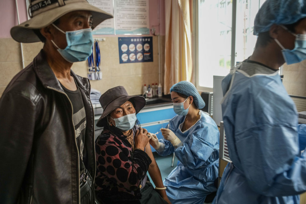 在四川甘孜州稻城縣疫苗接種點(diǎn),當(dāng)?shù)厝罕娫诮臃N新冠病毒疫苗。這批疫苗經(jīng)過(guò)三天冷鏈運(yùn)輸,從北京送到2000多公里以外的稻城,保證當(dāng)?shù)厝罕娊臃N(2021年7月24日攝)。