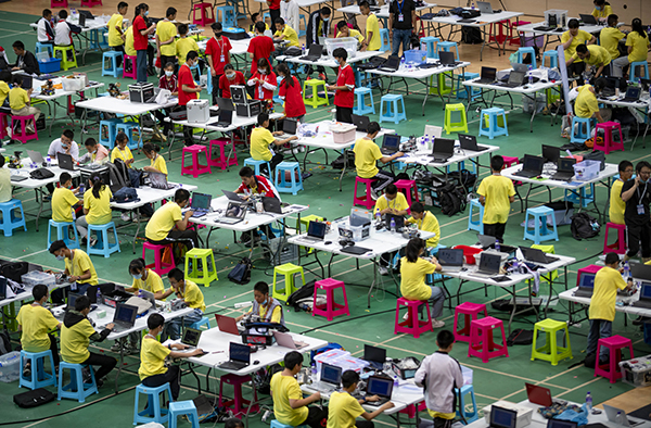 5月29日,第35屆云南省青少年科技創(chuàng)新大賽舉行。圖為參賽學(xué)生在比賽待賽區(qū)調(diào)試機(jī)器人。