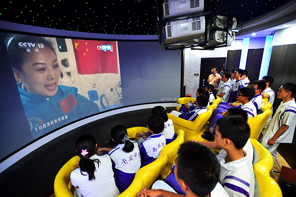 圖為2013年6月20日,在南開中學(xué)航天體驗(yàn)館,學(xué)生們通過(guò)弧形屏幕觀看中國(guó)首次太空授課。