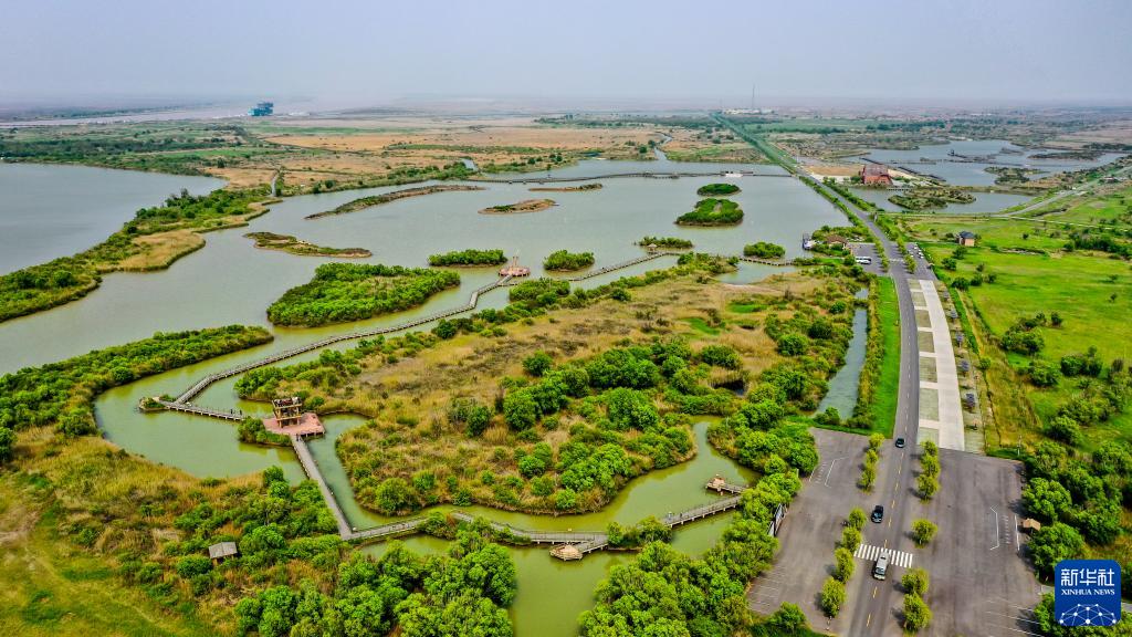 夏日的東營(yíng)市黃河入?跐竦,綠草連天、百鳥(niǎo)翔集。