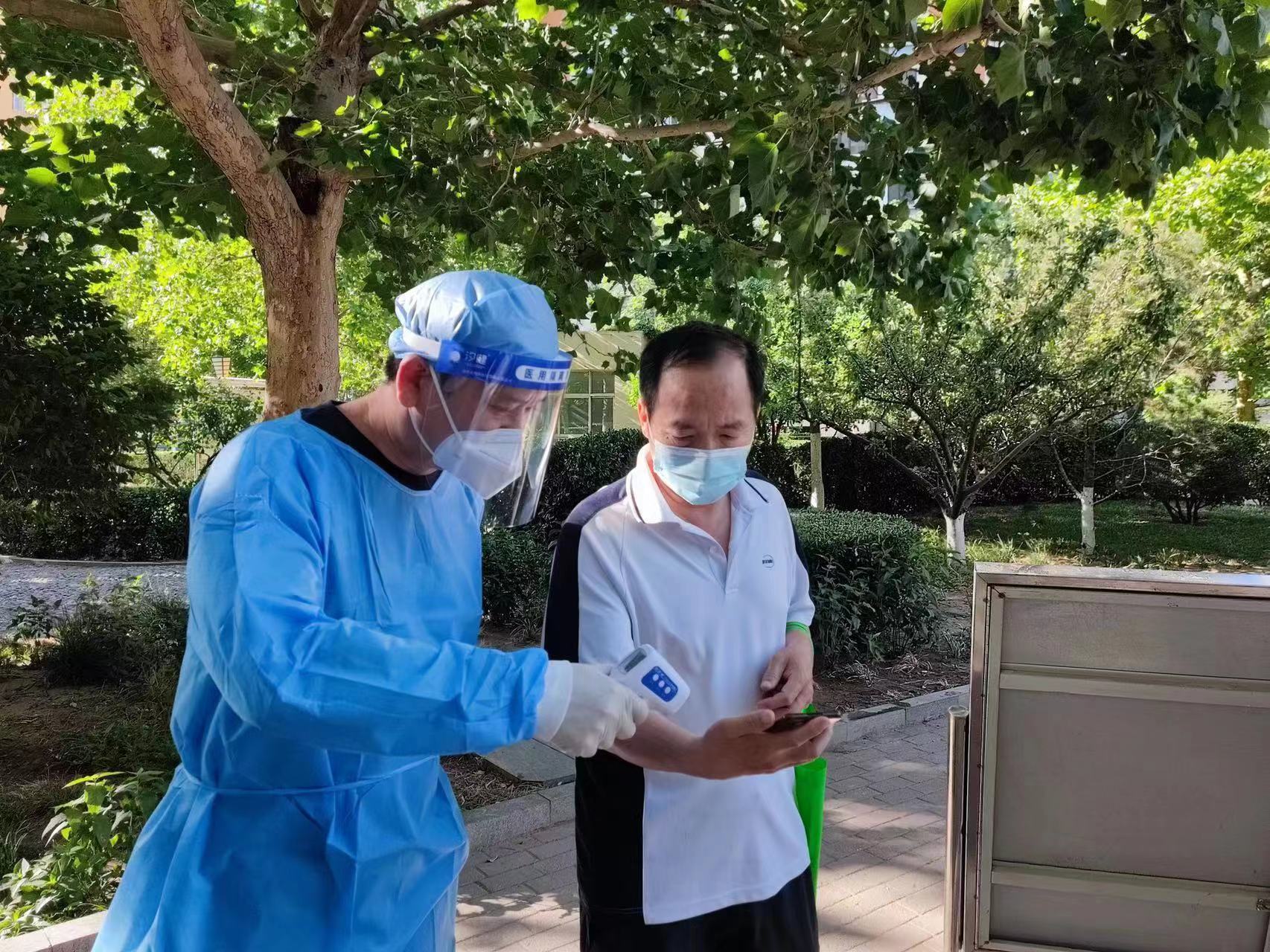 5月30日上午,楊志強利用工作之余,到豐臺區(qū)草橋欣園社區(qū)進行核酸檢測志愿服務(wù)。冒著酷暑,他認(rèn)真地為居民測體溫!白鳛橥辽灵L的豐臺人和示范中心黨支部書記,能為社區(qū)疫情防控盡一份力,以實際行動帶動示范中心黨員干部支援充實社區(qū)防疫力量,我責(zé)無旁貸!睏钪緩娬f。他不僅自己到社區(qū)做防疫志愿者,還發(fā)動全中心的干部職工積極報名下沉社區(qū)或者利用居家辦公時間到社區(qū)做志愿者。自4月底以來,示范中心已有10名黨員干部分期分批下沉到石景山、通州、朝陽、西城、豐臺的社區(qū)。從4月底至6月9日,示范中心28名黨員干部在居家辦公期間到社區(qū)參加核酸檢測、社區(qū)卡口值守等志愿服務(wù),共計111人次。在豐臺區(qū)緊急啟動全員核酸檢測的關(guān)鍵時刻,示范中心所在屬地太平橋街道蓮花池社區(qū)急需人手協(xié)助核酸檢測,得知情況后,示范中心領(lǐng)導(dǎo)班子指揮物業(yè)公司平均每天調(diào)派6名人員到核酸檢測點支援屬地街道社區(qū)疫情防控,負(fù)責(zé)維護核酸檢測秩序,這支抗疫小分隊從4月28日上崗,一直服務(wù)至今。