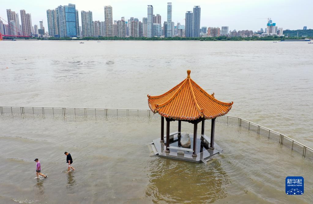 6月11日,兩名市民離開湖北武漢武昌區(qū)江灘黃花磯涼亭(無人機(jī)照片)。