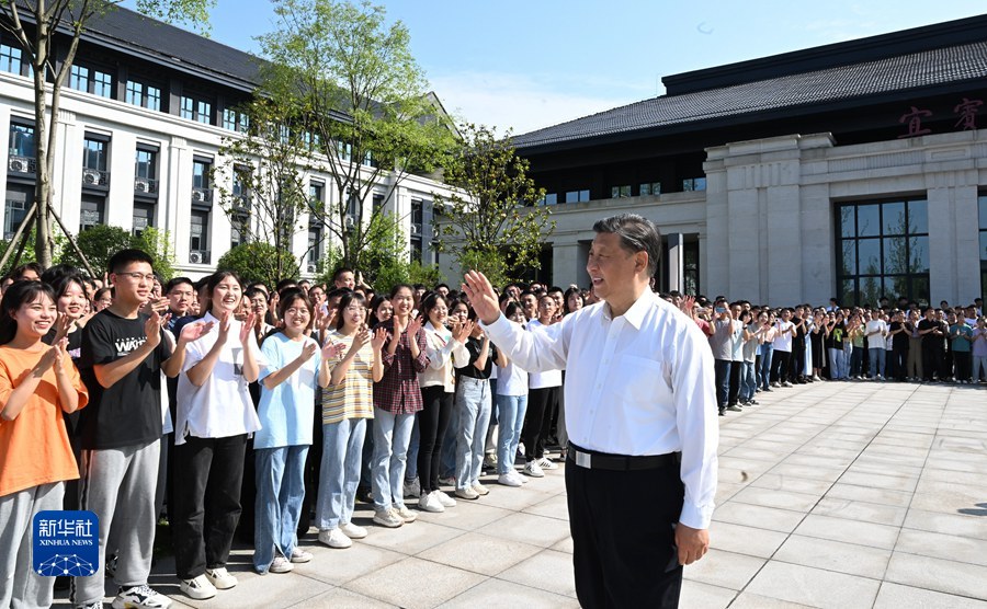 6月8日,中共中央總書記、國家主席、中央軍委主席習(xí)近平在四川考察。這是8日下午,習(xí)近平在宜賓學(xué)院考察時,向師生們揮手致意。新華社記者 李學(xué)仁 攝