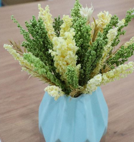 陳俊璋和公司團(tuán)隊(duì)研發(fā)打造的藜麥永生花。新華社記者文靜攝