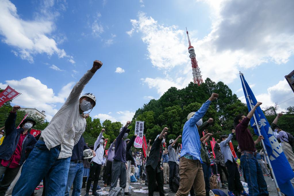 5月22日,民眾在日本東京舉行抗議集會。來自日本各地的數(shù)百名民眾在東京舉行集會和示威游行,抗議美國總統(tǒng)拜登當天開始的訪日之行,抵制日美首腦會晤和美日印澳“四邊機制”峰會。(新華社記者張笑宇攝)