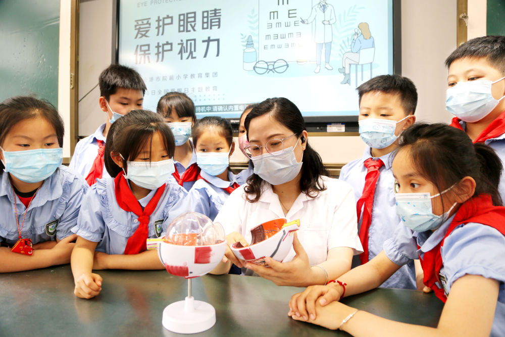 ↑在江蘇省連云港市院前小學(xué),校醫(yī)為學(xué)生講解保護(hù)眼睛的常識(shí)(2022年6月6日攝)。
