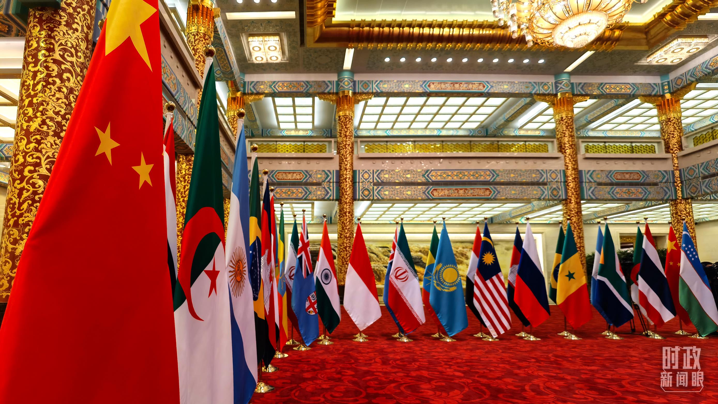 全球發(fā)展高層對話會的中方會場,設(shè)在人民大會堂金色大廳。林立的參會國旗幟、紅色的地毯,映襯著會議的熱度。
