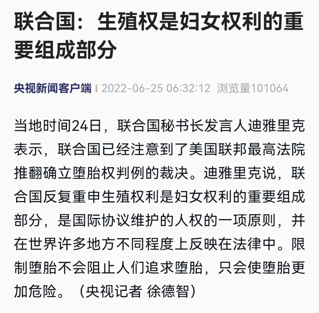 當?shù)貢r間24日,聯(lián)合國秘書長發(fā)言人迪雅里克表示,聯(lián)合國已經(jīng)注意到了美國聯(lián)邦最高法院推翻確立墮胎權(quán)判例的裁決。迪雅里克說,聯(lián)合國反復重申生殖權(quán)利是婦女權(quán)利的重要組成部分,是國際協(xié)議維護的人權(quán)的一項原則,并在世界許多地方不同程度上反映在法律中。限制墮胎不會阻止人們追求墮胎,只會使墮胎更加危險。