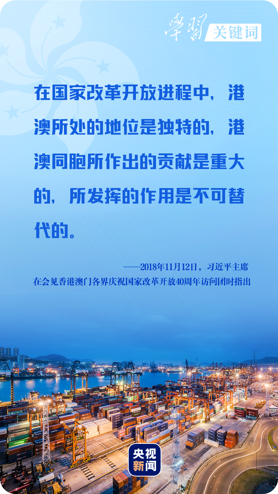 “香港背靠祖國(guó)、面向世界,有著許多有利發(fā)展條件和獨(dú)特競(jìng)爭(zhēng)優(yōu)勢(shì)。特別是這些年國(guó)家的持續(xù)快速發(fā)展為香港發(fā)展提供了難得機(jī)遇、不竭動(dòng)力、廣闊空間。”2017年7月1日,習(xí)近平主席在慶祝香港回歸祖國(guó)二十周年大會(huì)暨香港特別行政區(qū)第五屆政府就職典禮上堅(jiān)定地說(shuō)。