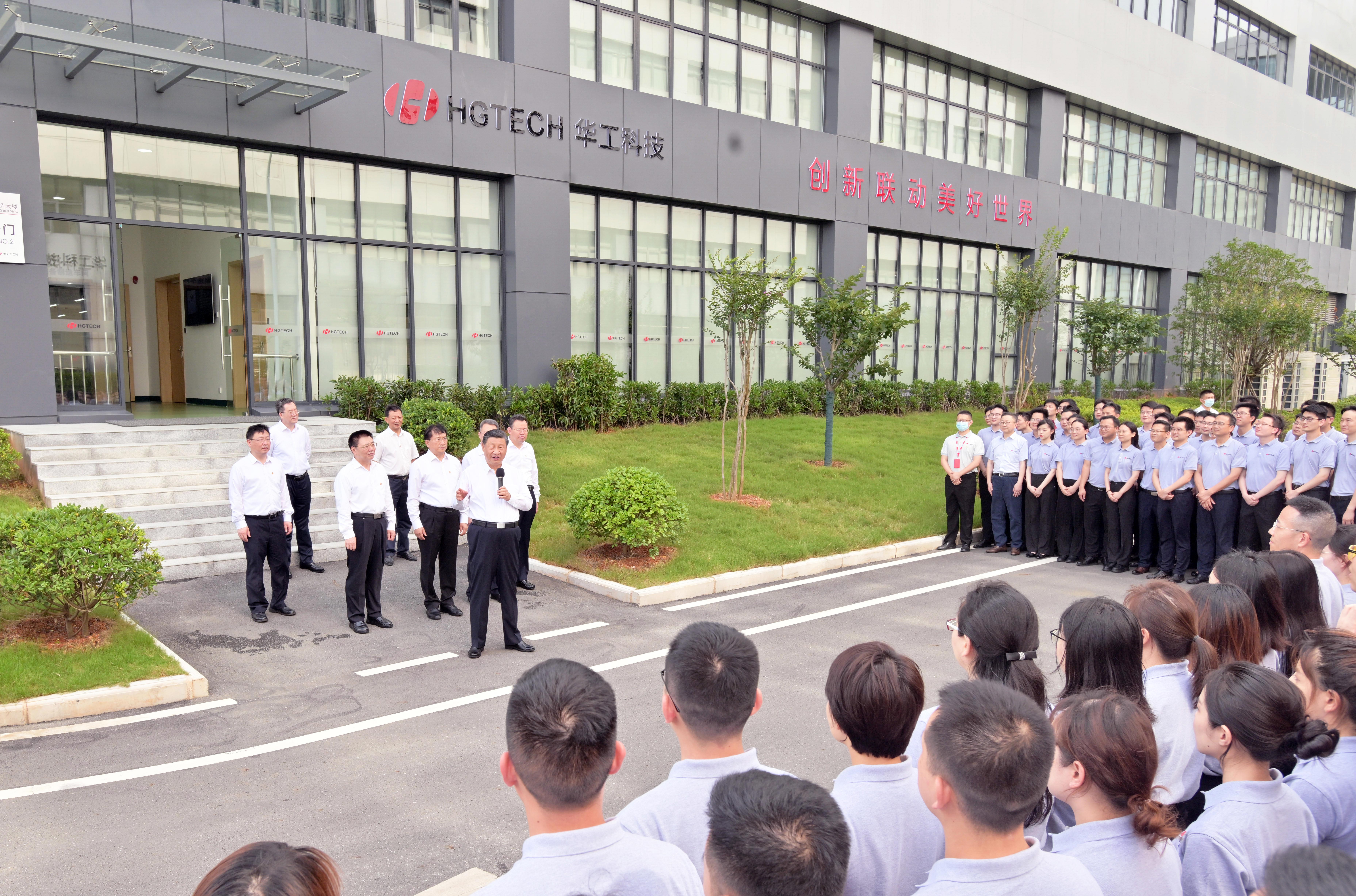 6月28日,中共中央總書記、國家主席、中央軍委主席習近平在湖北省武漢市考察。這是28日下午,習近平在武漢華工激光工程有限責任公司車間大樓前,同企業(yè)職工親切交流。