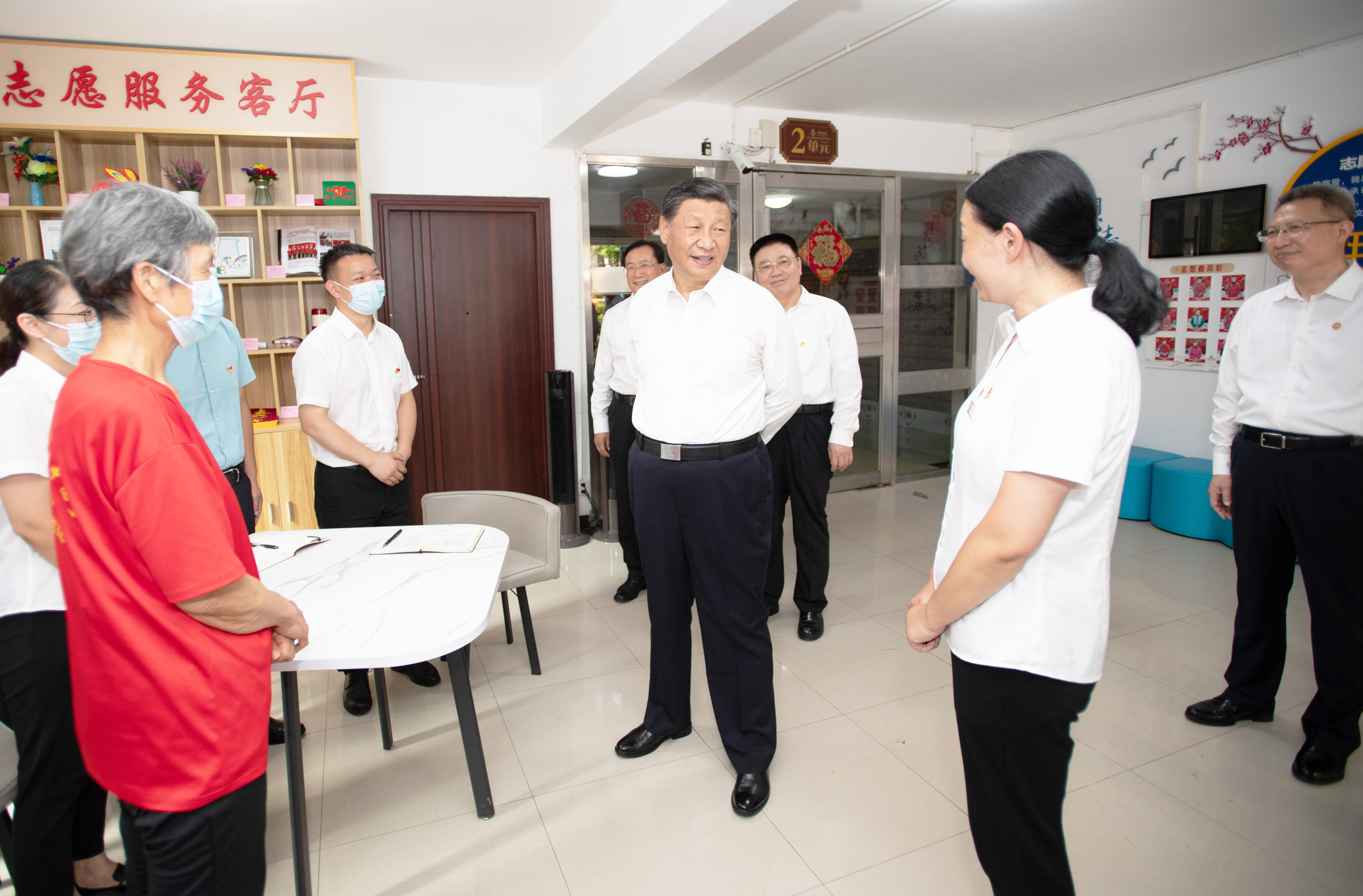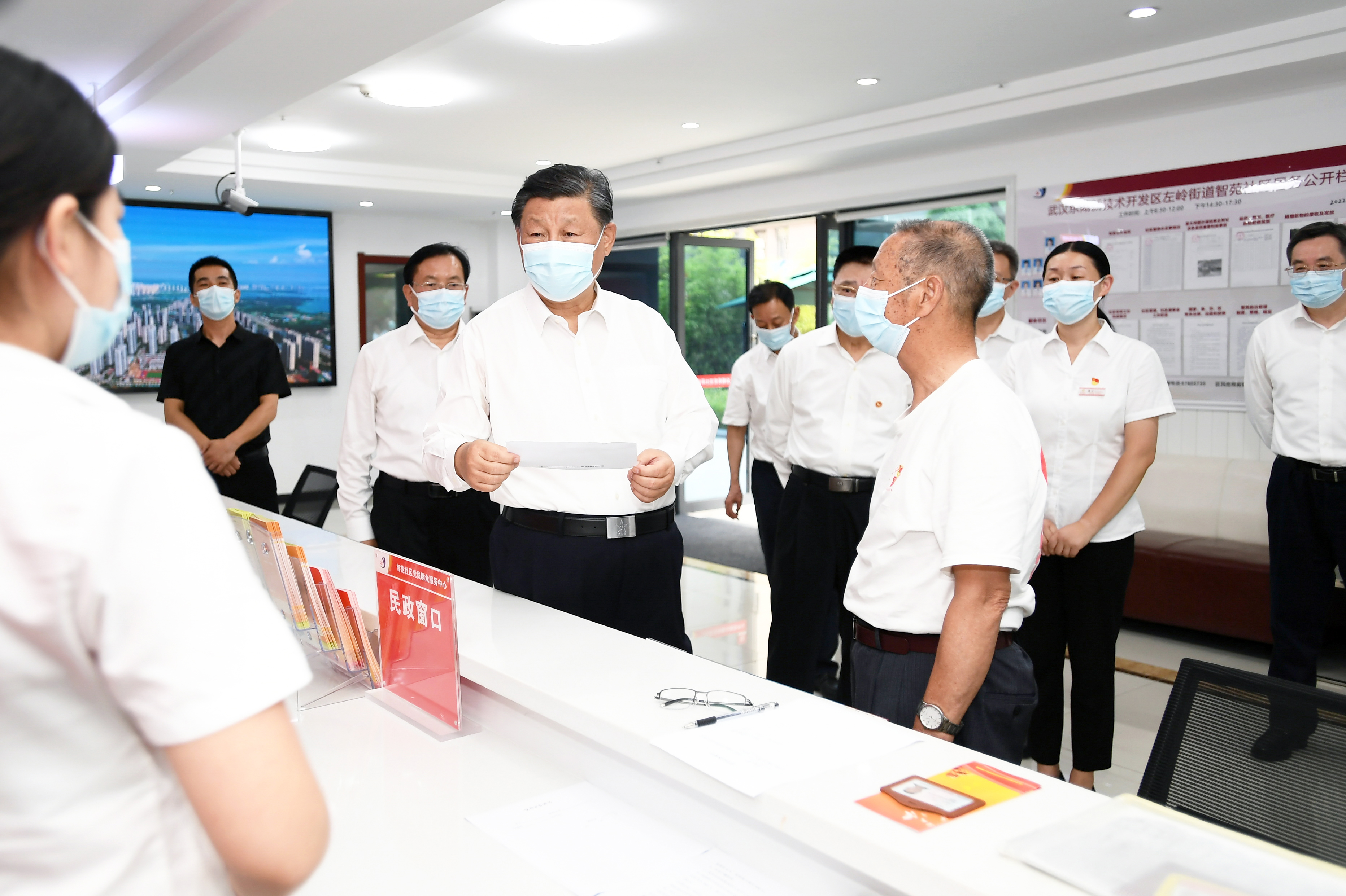 6月28日,中共中央總書記、國家主席、中央軍委主席習近平在湖北省武漢市考察。這是28日下午,習近平在東湖高新區(qū)左嶺街道智苑社區(qū)黨群服務中心,向社區(qū)工作者了解黨建引領基層社區(qū)治理及便民服務等情況,并同前來辦事的老年人親切交談!