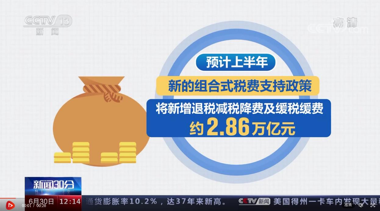 截至6月25日,累計新增退稅減稅降費及緩稅緩費約2.58萬億元。預(yù)計上半年,這一數(shù)字將達(dá)到約2.86萬億元。