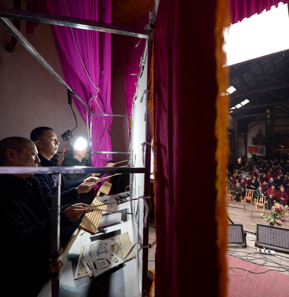 在湖南省瀏陽市沙市鎮(zhèn)秧田村,宋偉軍(左二)和劇團成員表演皮影戲(2021年11月16日攝)。新華社記者 陳振海 攝
