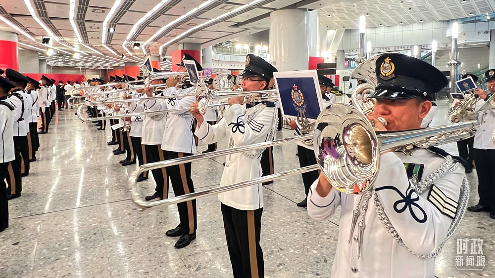 當(dāng)天,香港西九龍站內(nèi),紅色的地毯、鮮艷的旗幟、涌動(dòng)的花束,表達(dá)著香港市民的熱忱。歡迎儀式上,由80人組成的香港警察樂隊(duì)奏響歡迎曲。這是一支有著70多年歷史的“元老”樂隊(duì)。因?yàn)樗麄兪褂玫臉菲鞫际倾y色,所以又被稱為“銀樂隊(duì)”。