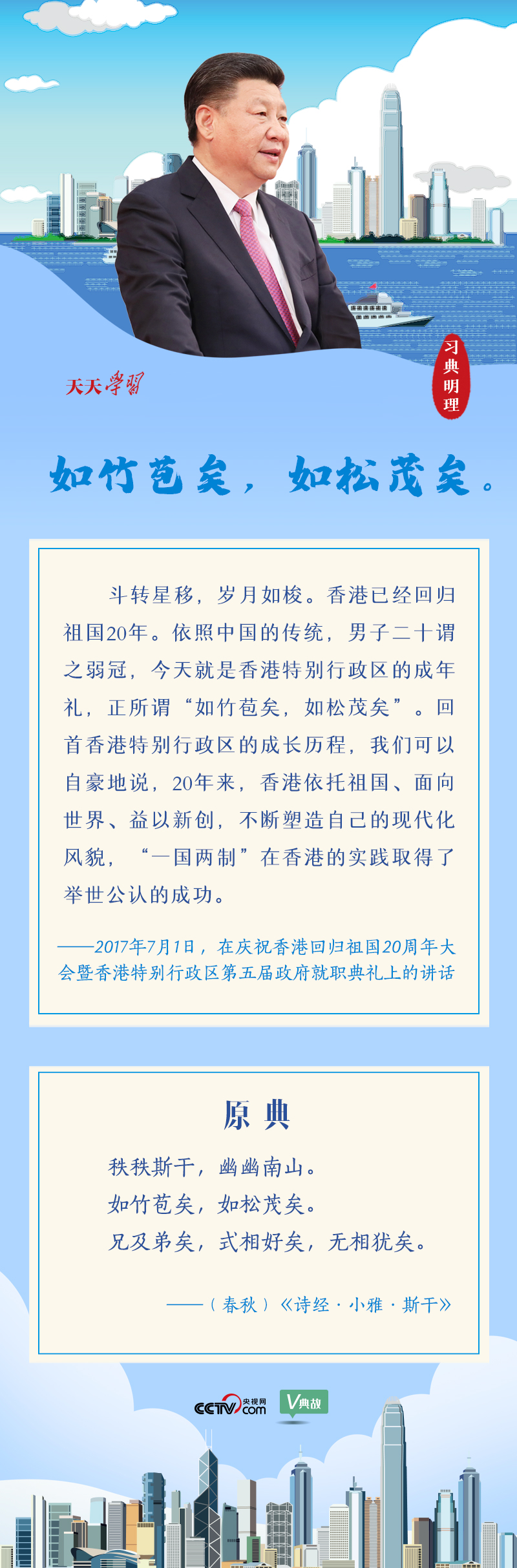 站在經(jīng)過(guò)歲月洗禮發(fā)生滄桑巨變的香江之濱,習(xí)主席撫今追昔,感慨萬(wàn)千,借用《詩(shī)經(jīng)》中富有特殊含義的“如竹苞矣,如松茂矣”,形容香港回歸祖國(guó)后繁榮發(fā)展的前景。