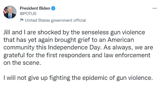 據(jù)美國哥倫比亞廣播公司(CBS News)報(bào)道,當(dāng)?shù)貢r(shí)間7月4日,美國伊利諾伊州海蘭帕克市的“獨(dú)立日”游行中發(fā)生槍擊事件,已至少6人死亡、超過20人受傷。拜登當(dāng)天在推文中寫道:“‘獨(dú)立日’發(fā)生的毫無意義的槍擊暴力事件再次給美國社區(qū)帶來悲痛,吉爾(拜登夫人)和我對(duì)此感到震驚。”