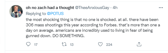 伊利諾伊州州長(zhǎng)普利茲克(Pritzker)就此事發(fā)表講話稱“沒有言語”可以形容那些遇難者和受傷者的親屬在這一天所遭遇的損失和悲傷。普利茲克表示:“在公開慶祝‘獨(dú)立日’時(shí),(槍手)藏在屋頂上,用突擊步槍射殺無辜的人,這種邪惡沒有言語可以形容。我也無法說出任何言語來減輕那些家庭的痛苦,他們的 7月4日不是‘慶!,而是‘悲傷’!备鶕(jù)非營(yíng)利組織的數(shù)據(jù),此次槍擊已是美國今年發(fā)生的第308起大規(guī)模槍擊事件。美媒稱,“獨(dú)立日”的這起大規(guī)模槍擊事件讓美國本已血腥的春季和夏季“更加血腥”。