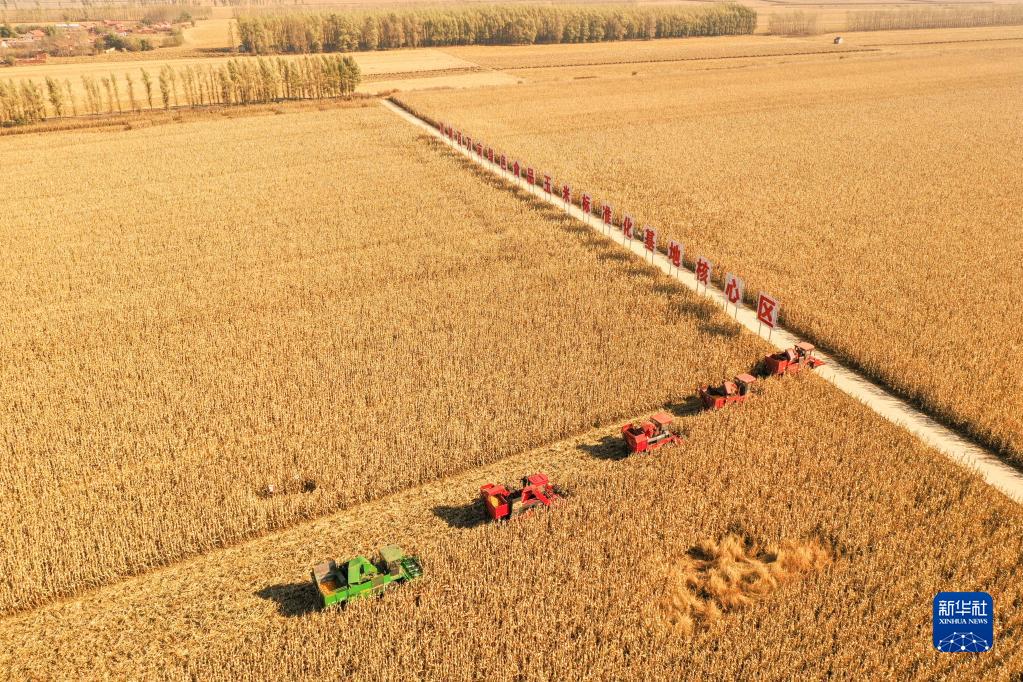 在吉林省梨樹縣國家百萬畝綠色食品原料(玉米)標準化生產(chǎn)基地核心示范區(qū),農民駕駛農機進行秋收作業(yè)(無人機照片,2021年10月23日攝)。新華社記者 張楠 攝