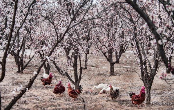 ↑一群雞鵝在陜西省榆林市榆陽區(qū)古塔鎮(zhèn)趙家茆村的杏樹林里覓食(2020年4月7日攝)。當(dāng)?shù)厝罕娫诎l(fā)展杏產(chǎn)業(yè)的同時(shí)發(fā)展林下經(jīng)濟(jì),成效顯著。