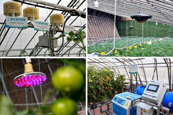 ↑這是在山東省壽光市現(xiàn)代農(nóng)業(yè)高新技術(shù)試驗(yàn)示范基地拍攝的ai智慧大棚內(nèi)景。左上為傳感器設(shè)備;右上為多功能植保機(jī);左下為補(bǔ)光燈;右下為電動(dòng)噴淋機(jī)(2020年4月21日攝)。