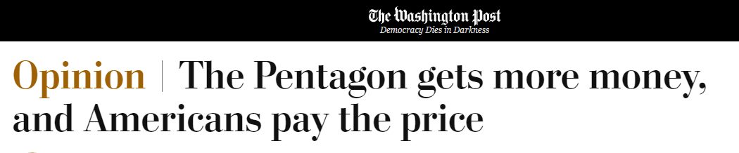 中國(guó)日?qǐng)?bào)網(wǎng)7月11日電 美國(guó)《華盛頓郵報(bào)》網(wǎng)站日前發(fā)表題為《五角大樓拿到了錢(qián),付出代價(jià)的是美國(guó)民眾》的評(píng)論文章,稱(chēng)雖然現(xiàn)如今華盛頓分裂嚴(yán)重,但有一件事卻能實(shí)現(xiàn)罕見(jiàn)的兩黨合作,這就是五角大樓的預(yù)算。