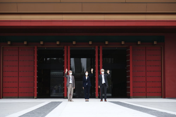 2022年5月10日,在香港故宮文化博物館,西九文化區(qū)管理局行政總裁馮程淑儀(中)、香港故宮文化博物館館長吳志華(右)和香港故宮文化博物館設(shè)計師嚴(yán)迅奇(左)在揮手致意。新華社記者 王申 攝