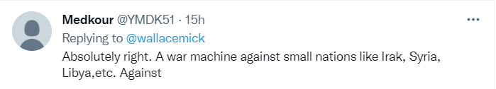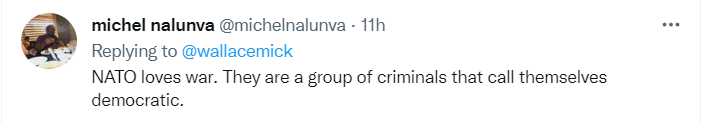 10日,華萊士以同樣的視頻配上不同的文字發(fā)了兩條推文,配文是他在視頻中講話的節(jié)選!氨奔s不是一個(gè)防御聯(lián)盟,而是一臺(tái)戰(zhàn)爭機(jī)器,”華萊士說,“去問問阿富汗、伊拉克和利比亞人民就知道了。北約的真正目的是捍衛(wèi)正在衰落的美國霸權(quán)以及一個(gè)單極世界體系,北約為此而存在!