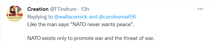 “就像這位男士所說,‘北約從未想要和平’。北約之所以存在,只是為了推動(dòng)戰(zhàn)爭和發(fā)出戰(zhàn)爭威脅!