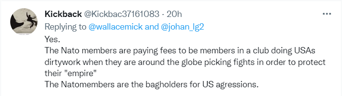 “是的。當(dāng)北約成員國在全球進(jìn)行戰(zhàn)斗以保護(hù)他們的‘帝國’時(shí),他們是在自己出錢,成為替美國干臟活俱樂部的成員。北約成員國是為美國侵略投資的冤大頭!