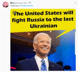另有網(wǎng)友發(fā)了一張圖,上面有美國總統(tǒng)拜登的形象,配文是“美國將與俄羅斯戰(zhàn)斗到只剩最后一個(gè)烏克蘭人”!