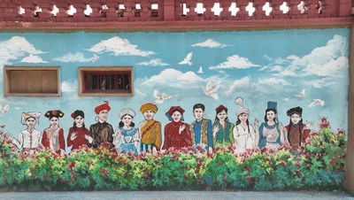 △當(dāng)?shù)氐奈幕瘔L上,專(zhuān)門(mén)呈現(xiàn)了新城西門(mén)村和十八洞村元素。(總臺(tái)記者曹江拍攝)