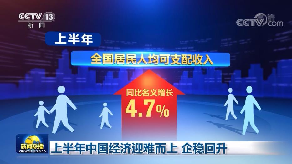從民生指標(biāo)看,物價(jià)總體平穩(wěn),就業(yè)形勢(shì)好轉(zhuǎn),居民收入穩(wěn)定增長。上半年,全國城鎮(zhèn)新增就業(yè)654萬人,完成年度目標(biāo)任務(wù)的59%。全國居民人均可支配收入同比名義增長4.7%。