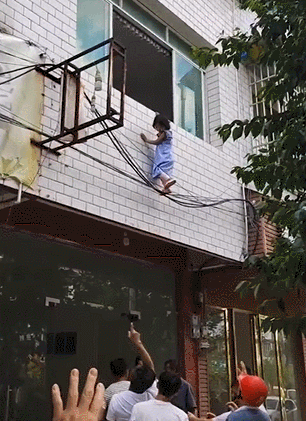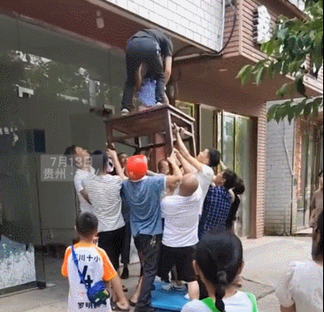 7月13日,貴州遵義一名小女孩被發(fā)現(xiàn)獨自掛在房屋外墻上,一只腳僅憑幾根電線懸吊著,而另一只腳已經(jīng)踩空,身子在半空中晃晃蕩蕩,小小的手掌眼看已經(jīng)快要抓不住窗沿,實在讓人捏一把冷汗。就在這時,周圍的路人趕緊沖上前來,一邊高聲提醒女孩千萬不要動,穩(wěn)定她的情緒,一邊抬桌子的抬桌子,救人的救人,短短十幾秒就搭起了一道"人梯",成功將小女孩安全救了下來。