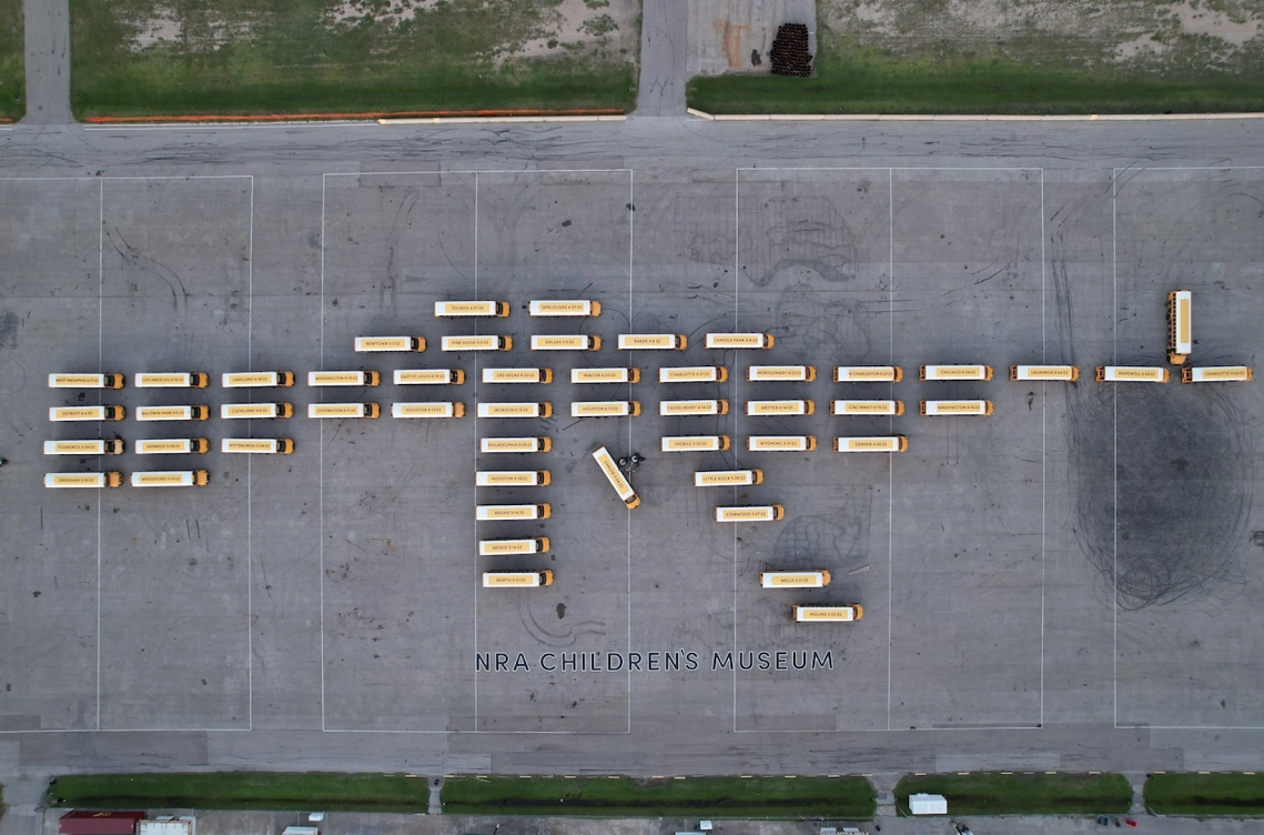 52輛校車被擺成突擊步槍的形狀,綿延1.6公里。校車上4368個空座位,哀悼自2020年以來死于槍支暴力的兒童。其中,第一輛校車上,還放置了校園槍擊案受害者的遺物,包括遺照和球衣等。
