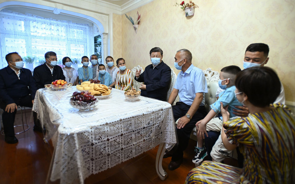 這是7月13日上午,習(xí)近平在烏魯木齊市天山區(qū)固原巷社區(qū),同維吾爾族居民阿布來提·吐爾遜一家人圍坐在一起拉家常。