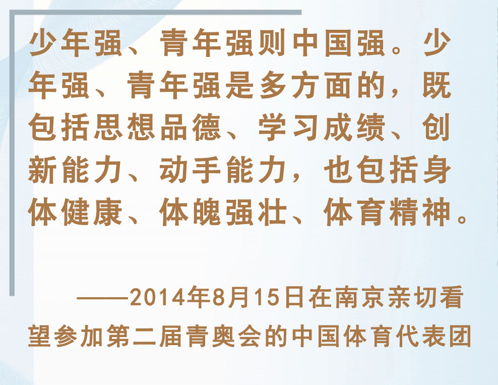 青少年是祖國的未來、民族的希望。強(qiáng)健的體魄是青少年成長成才的重要前提。對加強(qiáng)體育教育,增強(qiáng)青少年體質(zhì),習(xí)近平總書記念茲在茲。
