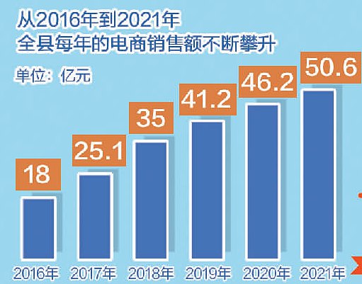 “大進大出、快進快出”模式,幫助武功電商快速搶占地盤,站到了新臺階上。18億元、25.1億元、35億元、41.2億元、46.2億元、50.6億元,從2016年到2021年,武功縣每年的電商銷售額不斷攀升。