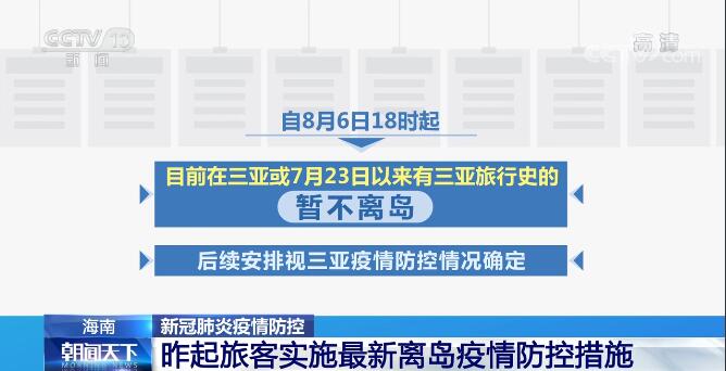自8月6日18時起,目前在三亞或7月23日以來有三亞旅行史的,暫不離島,后續(xù)安排視三亞疫情防控情況確定;7月23日以來無三亞旅行史,目前在涉疫市縣(區(qū))且在管控區(qū)域外的,72小時3次核酸檢測陰性,并完成風(fēng)險排查后方可離島;7月23日以來無三亞旅行史,目前在非涉疫市縣(區(qū)),48小時2次核酸檢測陰性,并完成風(fēng)險排查后方可離島。
