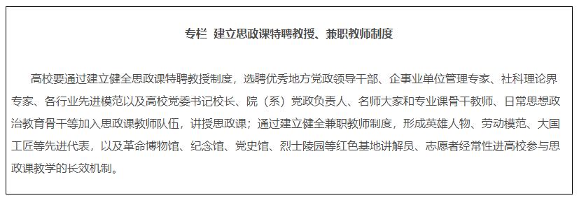 14.建設專兼結合的師資隊伍。各地各校嚴格按照要求配備建強高校專職思政課教師、輔導員隊伍,提高中小學專職思政課教師比例,實行思政課特聘教授、兼職教師制度,積極聘請黨政領導、科學家、老同志、先進模范等擔任思政課兼職教師。深入實施馬克思主義學院院長(書記)培養(yǎng)工程,通過集中培養(yǎng)培訓、委托重大項目、加強實踐鍛煉、開展國際國內訪學等方式,培養(yǎng)一批青年馬克思主義理論家。
