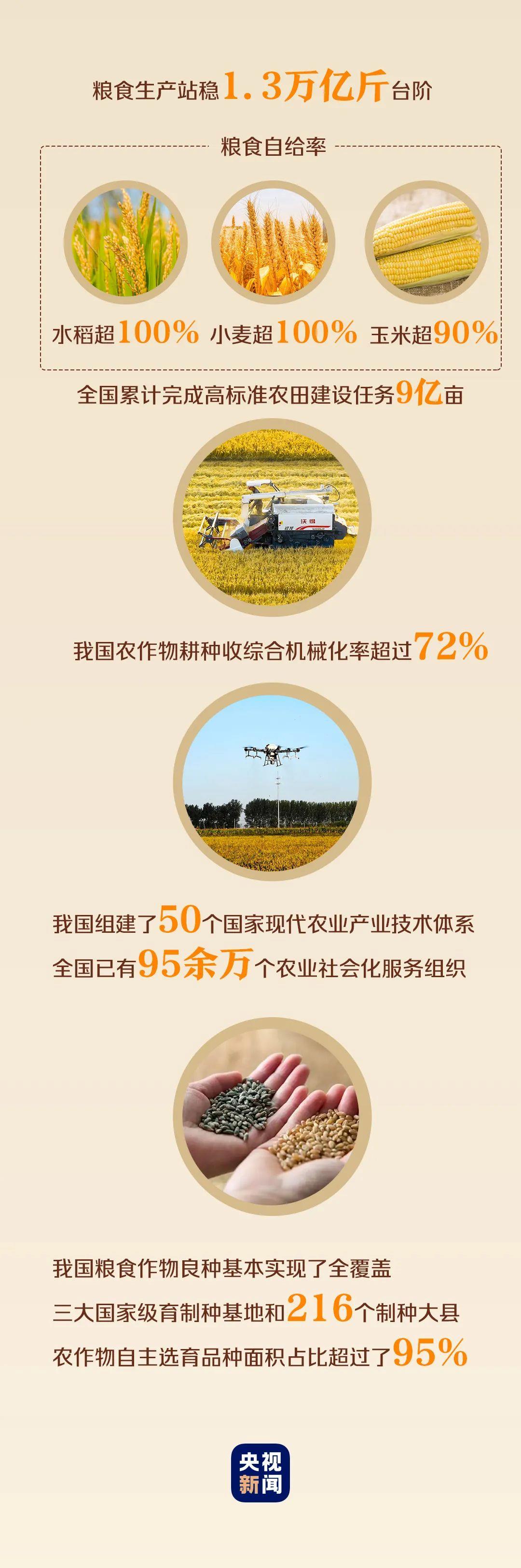 黨的十八大以來,以習(xí)近平同志為核心的黨中央始終把糧食安全作為治國(guó)理政的頭等大事。我們時(shí)刻緊繃糧食安全這根弦,著力穩(wěn)面積、提單產(chǎn)、強(qiáng)產(chǎn)能,調(diào)動(dòng)農(nóng)民種糧積極性,實(shí)施“藏糧于地、藏糧于技”戰(zhàn)略,糧食生產(chǎn)實(shí)現(xiàn)連年豐收,為應(yīng)對(duì)各種風(fēng)險(xiǎn)挑戰(zhàn)、實(shí)現(xiàn)我國(guó)經(jīng)濟(jì)社會(huì)穩(wěn)定發(fā)展筑牢了“壓艙石”。