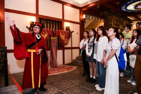 未入學(xué)宮,同學(xué)們已被經(jīng)典建筑形制的細(xì)節(jié)與精妙深深折服。踏進(jìn)學(xué)宮,內(nèi)中一磚一石,亦皆有奧妙。同學(xué)們跟隨向?qū)У哪_步,目不暇接,美不勝收,夢回那令人神往的盛世。來自敘利亞的留學(xué)生王鴻宇邊聽講解邊不住點(diǎn)頭,忍不住感慨中華文化博大精深。