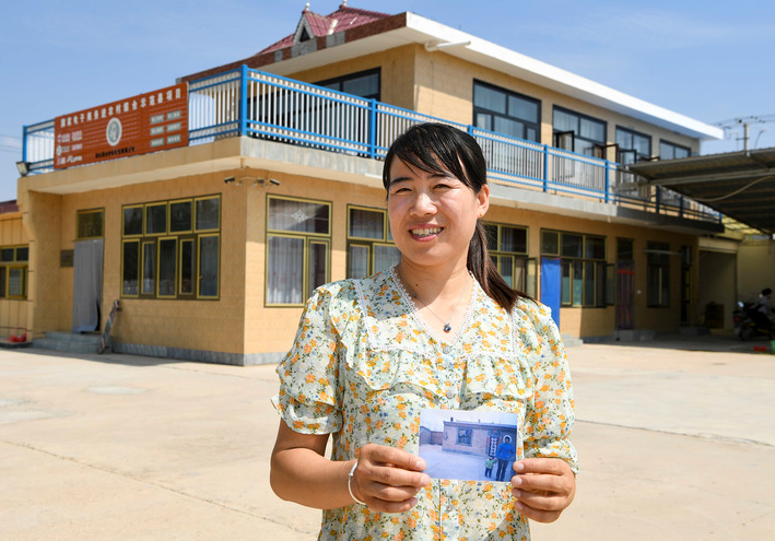 2022年8月4日,王航弟在寧夏吳忠市紅寺堡區(qū)新莊集鄉(xiāng)白墩村自家二層樓房前,她手里拿著的是10多年前住房的照片。新華社記者馮開華 攝