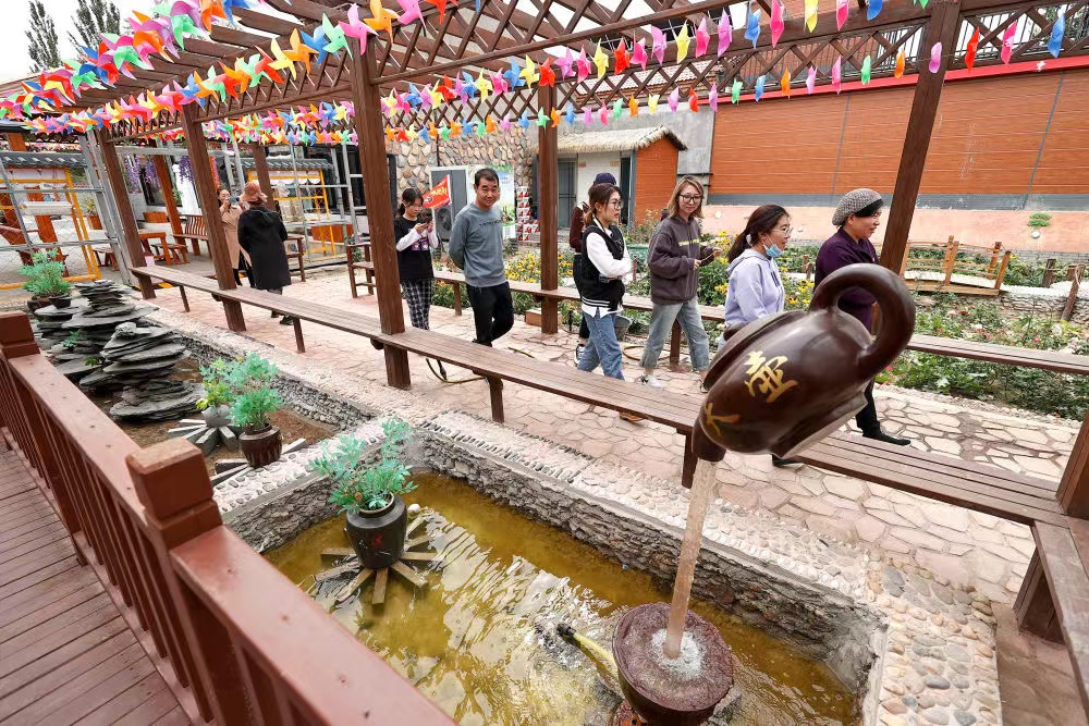 國慶節(jié)假期,游客在永新村農(nóng)家樂“共享庭院”中漫步。新華社記者馮開華 攝